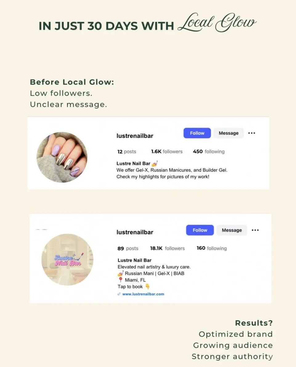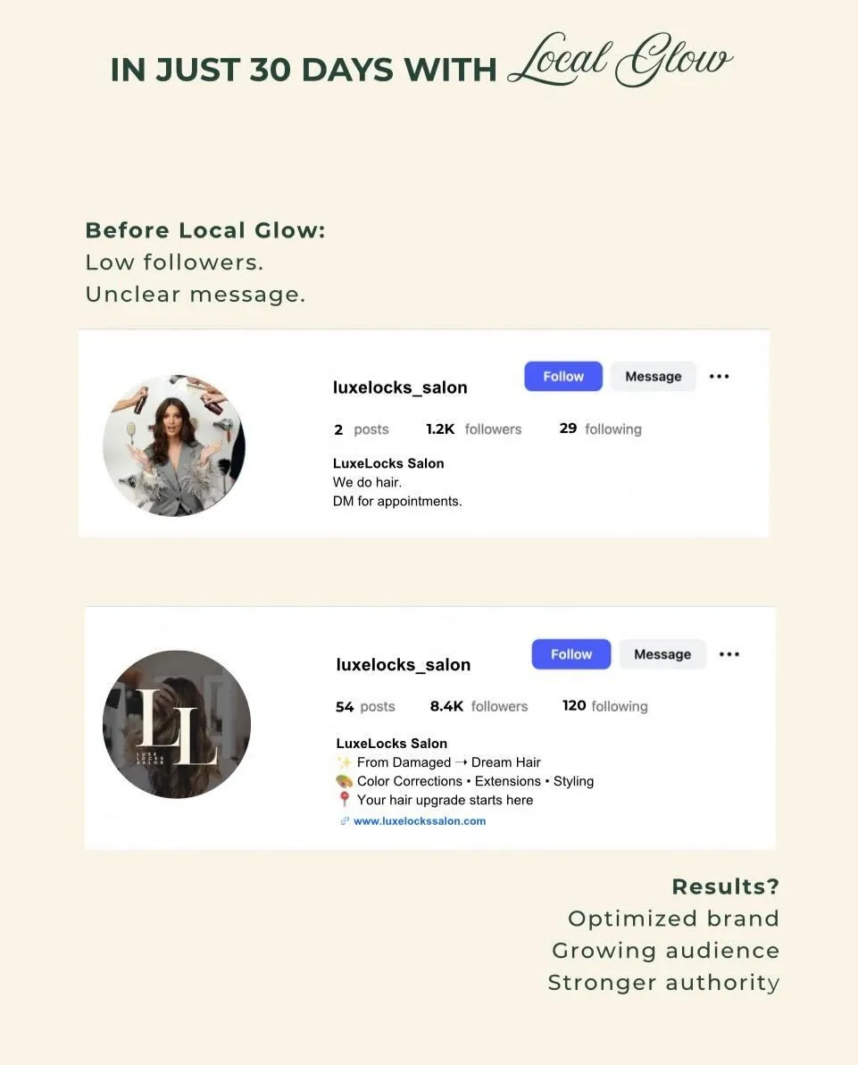 Option 2: Grab your Local Glow Content Calendar for $97. In 7 days, you'll have a custom 30-day content plan built by a 7-figure salon owner who grew his brand with this exact strategy. You'll know exactly what to post, when to post it, and why it works.