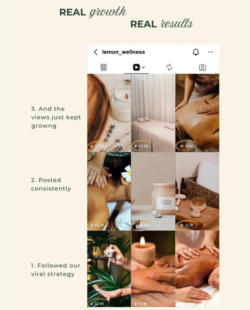 His content went from getting 1-5K views per post to consistently hitting 100K+ views per month. Not by chasing trends or posting motivational quotes. By developing a system of industry-specific content themes, proven hooks, and a posting rhythm designed specifically for beauty and wellness businesses.